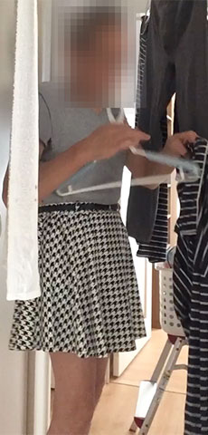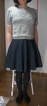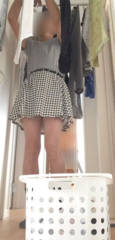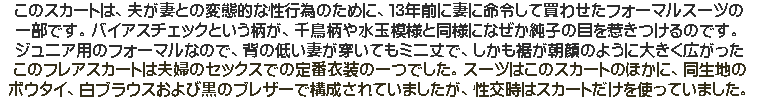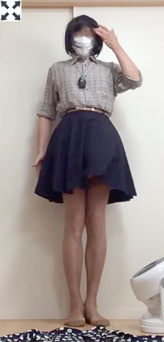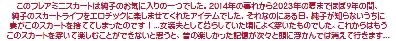 妻が突然決行する衣類の断捨離を夫が何とか宥め続けた結果、今もこのフレアーミニスカートは残っています。でも、今の純子のウエストにはとても入りません...