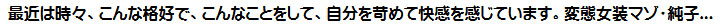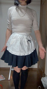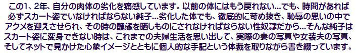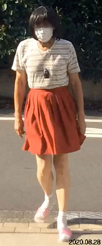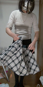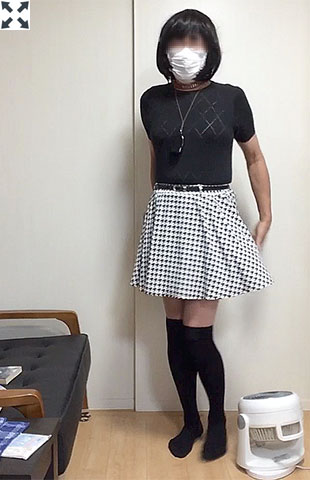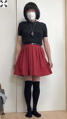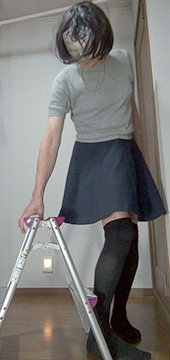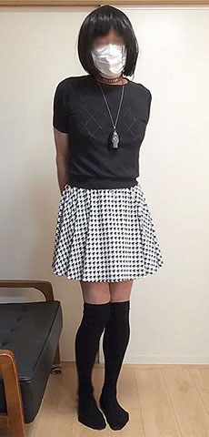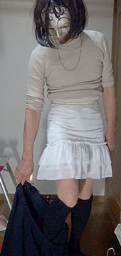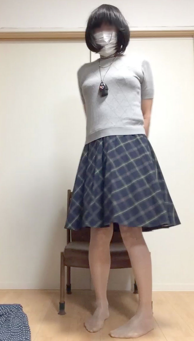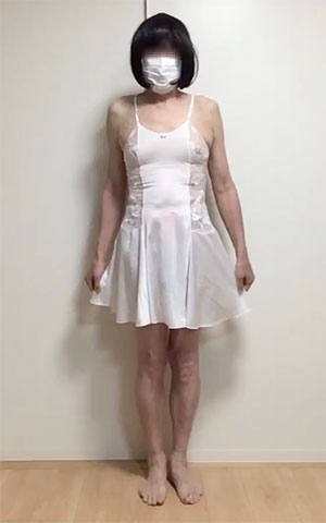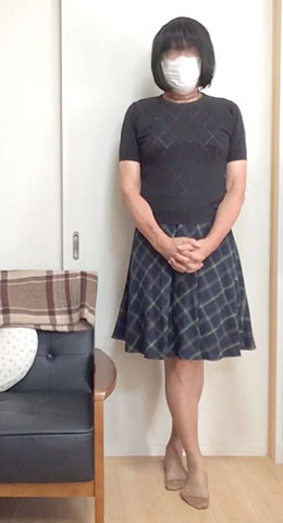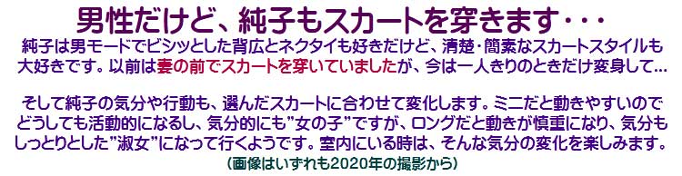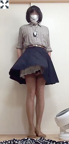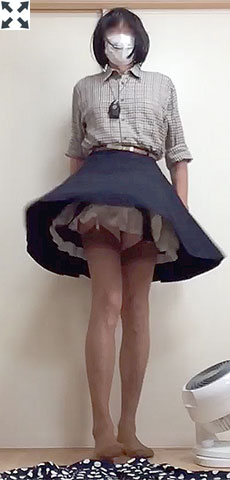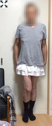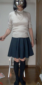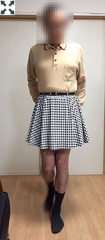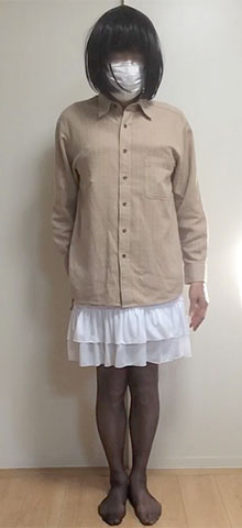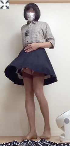 別ページにまとめておきました。ウィッグもつけずトップスは男物、下半身のみペチコートや下着・レッグウエアも含めて完全なスカート姿の女装夫です。