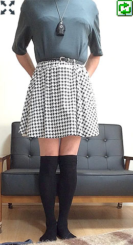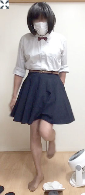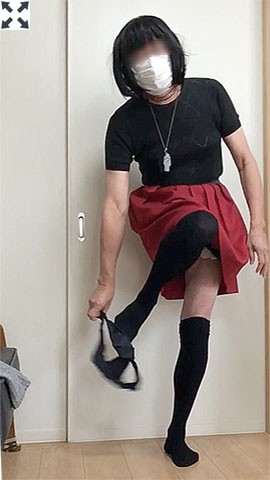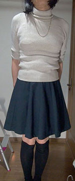 膝丈からミニ丈のスカートに穿き替える時間の余裕がありました。ストッキングは脱いでオーバーニーハイに替えました。