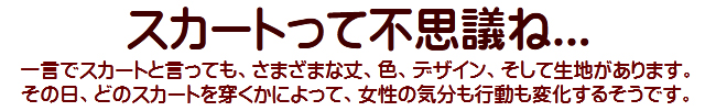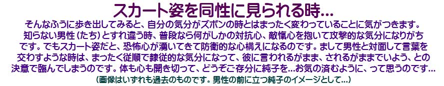 男モードだと、座るときには無意識に脚を開いてしまいます。でもスカート姿だと、自然と膝を揃えて固く閉じるるようになります。これも無意識のしぐさです...