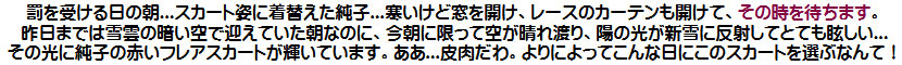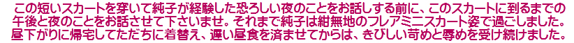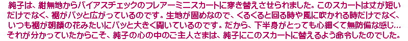 帰宅直後の純子が、恥ずかしいくらい短いバイアスチェックのフレアースカート姿で捕らえられ、無残な辱めと厳しい訊問を受ける想像に酔っています...