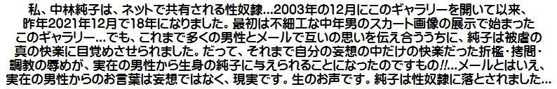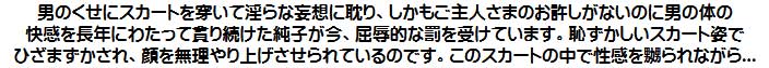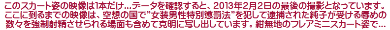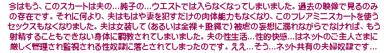 今回の<動画、この1篇!>には、妻の前にスカート姿で立たされ、性器に装着した淫具を弄ばれて強制射精させられた思い出の1篇を選びました...