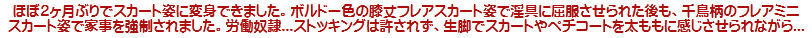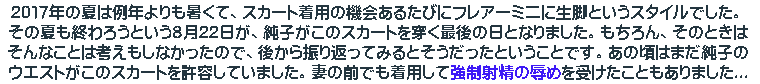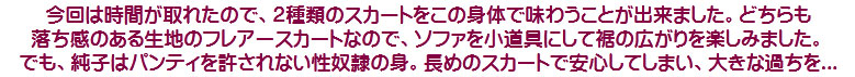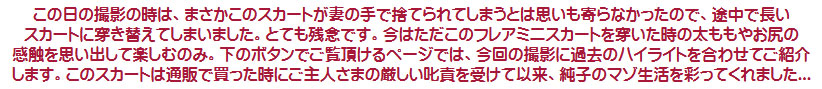 2014年暮れ〜2017年秋の妻の前でのスカート生活については、妻の性奴隷としての生活のほか、スカート姿での家事奴隷としての生活も合わせて