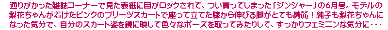 梨花ちゃんの可愛さとピンク色のプリーツスカート、そして、その裾から伸びた脚...純子は自分が女性になった気分で、女らしいポーズを楽しみました。
