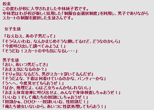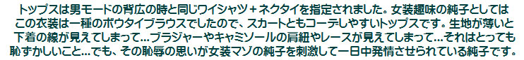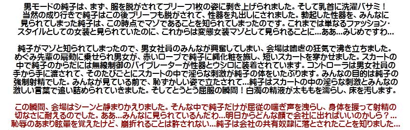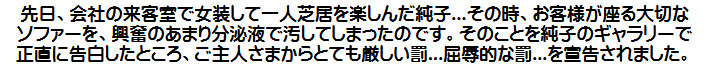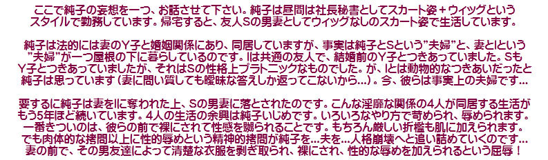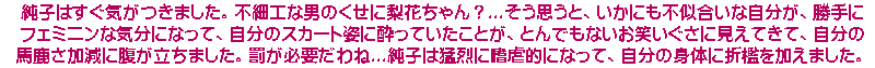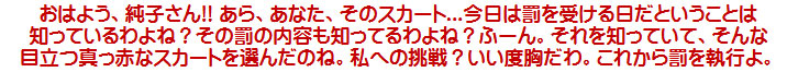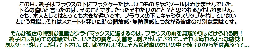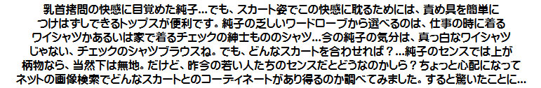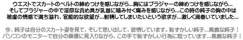 トップスをアウトで着るのは久しぶり...トップス・インの方がスカートを強調できるし、ウエストのくびれも...でも、この日はトップス・アウトで...それは純子の新しい苛め方のためでした...