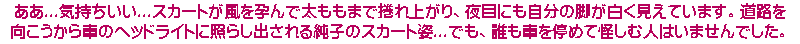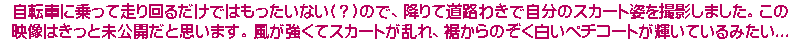 目の下に広がるスカートと規則的に上下する太もも...ああ...風が脚に当たってとっても気持ちいい...いつも昼間に男モードで通る道を、深夜にスカート姿で走る背徳の思い...