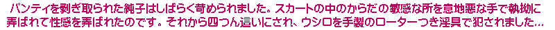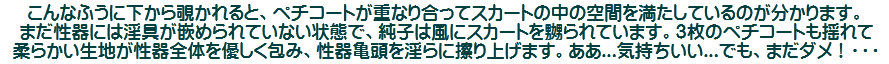 スカートの下...3枚のペチコートの奥...ではパンティを脱がされてから、あらたに股割れパンティを穿かされました。性器はノーパンと同じ剥き出し状態です...
