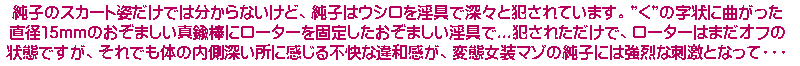 あの夜と同じ服装...スカートの中も同じです。赤いロープの股縄と白いレースの股割れパンティ...そして、手製の淫具でウシロを深々と犯されたまま、繋がれている純子...