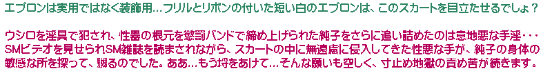 ウシロを淫具で犯されたまま純子はエプロンを着け、カメラの前に立たされました。どんな気分、純子さん?意地悪な声が耳に響きます。エプロン姿を見ただけでは