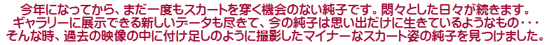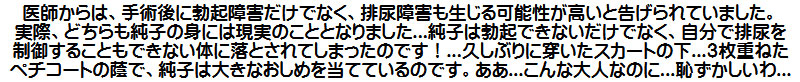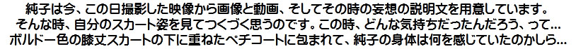 スカートの下にはいつものランジェリー...純子の恥ずかしい秘密はそれだけではありません。スカートの下で、純子は股間におしめをしています。おしっこが漏れて染みにならないように...
