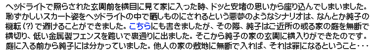 ならなかったことでした。純子の家の玄関前にヘッドライトを点けたままで駐車している車がいたので、別の方向から家に近づこうと思ったのですが、そのためには街の一画を