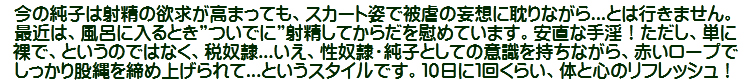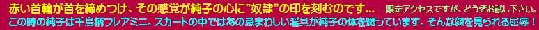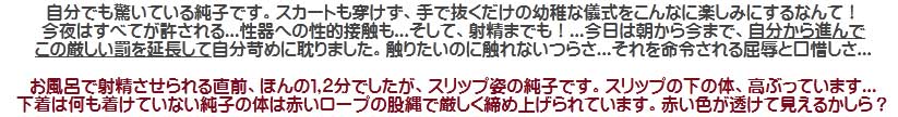 性奴隷・純子はパンティを禁じられています。スカートの中で厳しく締め上げられた赤いロープの股縄を感じさせられながら、立ったり座ったり...すっかり発情させられた純子です...
