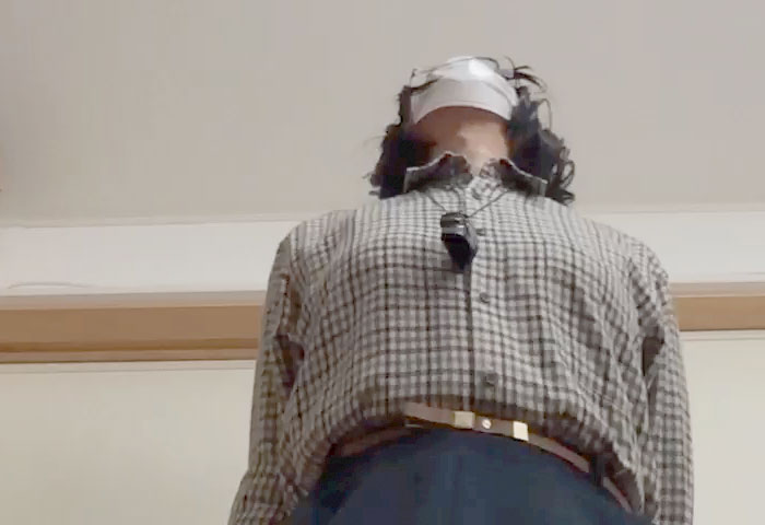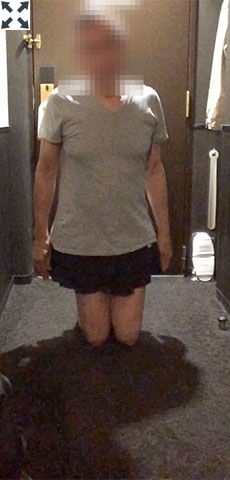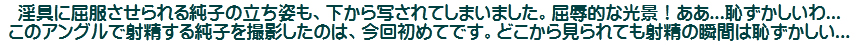 カメラは3台。左は床上40cmくらい、右はいつもの位置でひざまずかされた純子と同じくらいの目の高さです。真ん中のカメラがこの日の本命でした。立った純子の視線です。