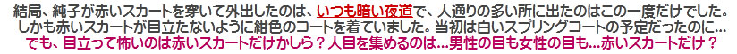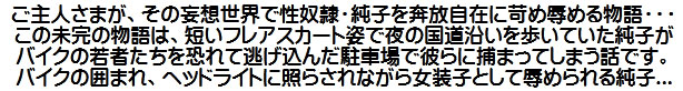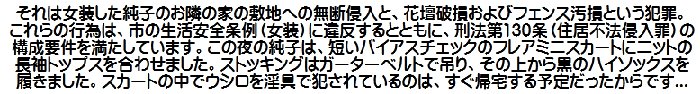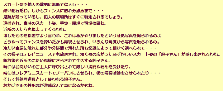 明らかに.この純子を...スカート姿の純子を...狙ってのこと。ライトに照らされる屈辱を避ける方途は、唯一つしかありません。純子は隣家敷地への不法侵入を決意しました...