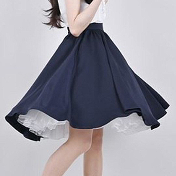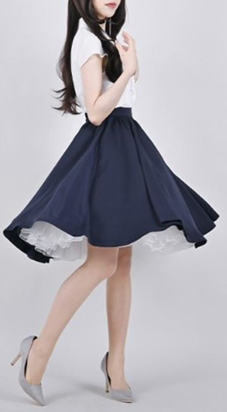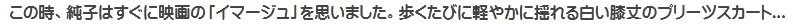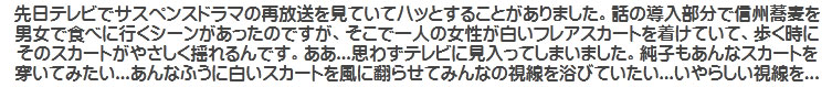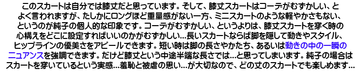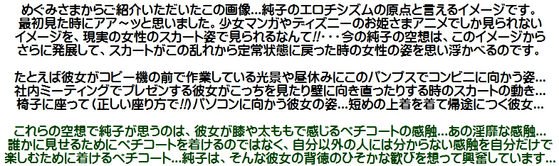 純子がうれしく思うのは、紺無地のフレアースカートから覗く白いペチコートの裾が、レースではなくメロウ仕上げになっていること...これって、純子のスタイルと同じ!!
