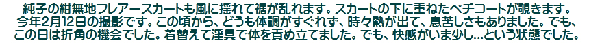 スカートの中で淫具に責められ、追い詰められ、そして絶頂にまで登り詰めさせられた純子...風に揺れるスカートが目の下に広がります...