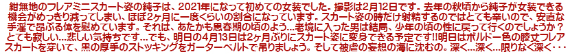 2020年は数年ぶりにスカート姿で外に出て撮影する機会がありました(ご主人さまからの厳しい命令で外に引きずり出されたのでした)。ああ...この風の感触!