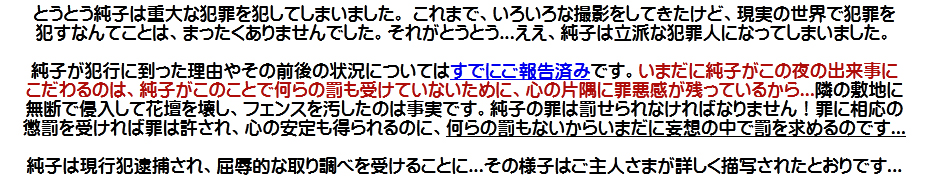 ああ...この夜の純子!...お隣の家の敷地に無断で侵入した上、そこの花壇を踏んで壊した上、フェンスを分泌液で汚しながら跨いで越えた時の純子は、まさにこの格好でした。