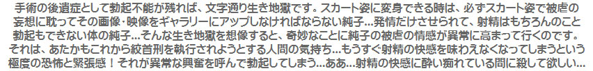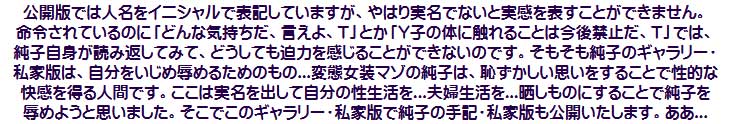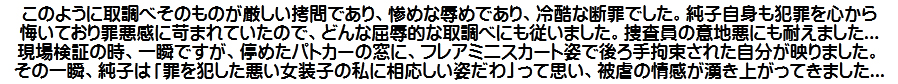 純子の手記には、現実だったこととその頃の妄想とが入り混じっています。今となっては自分でも区別できません。純子はこの手記を自分を苛めるため、辱めるために綴っています...