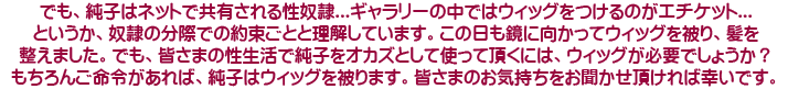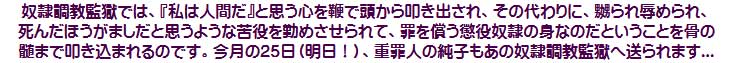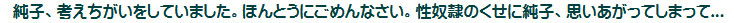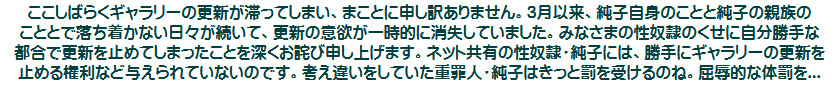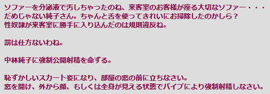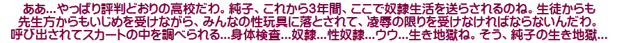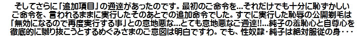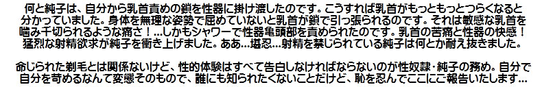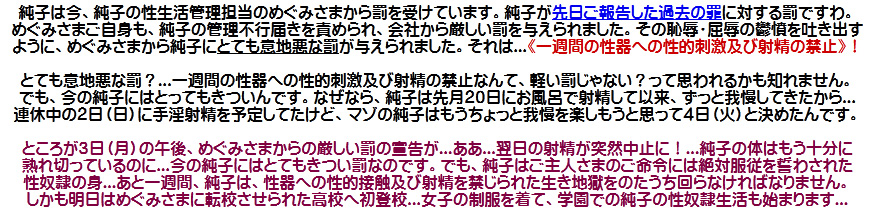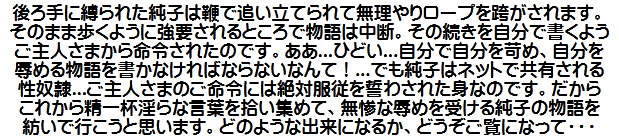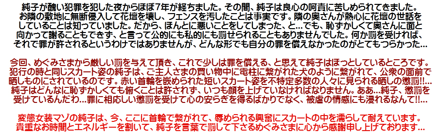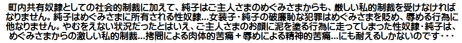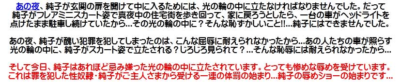 ええ、そうですわ。純子は今、ご主人さまから...めぐみさまから...厳しい罰を受けているのです。晒しものにされる辱め...それは、明日から始まる本格的著罰のプロローグ...