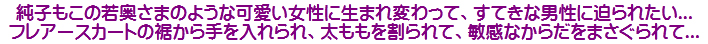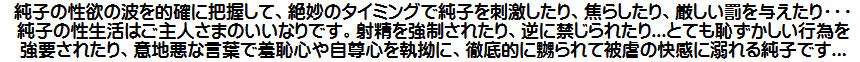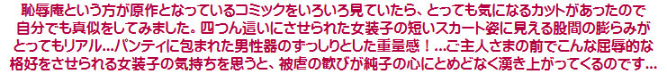女性としての正しい動作を躾けられる純子...ああ...躾けられているんだわ...調教されているんだわ...って思うと、マゾの純子はスカートの中で身体がつらくなって・・・