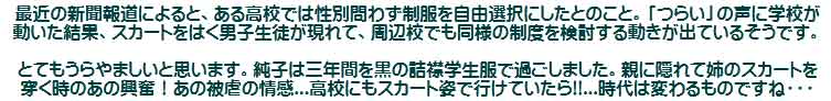 虫のいい話であることは夫の私もよく分かっていたので、妻の言う通りにしました。その結果は元の純子...妻の目を盗んで愉しむスカート女装です...