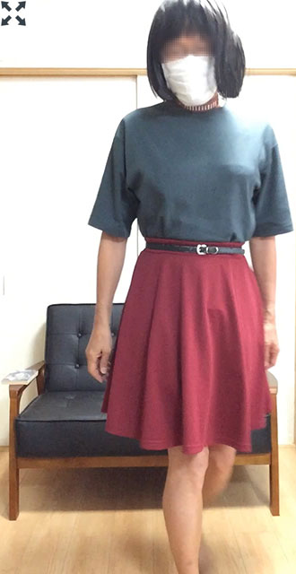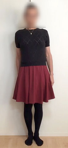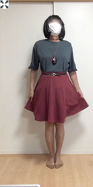 この日、最初に穿いたのはボルドー色の膝丈フレアスカートでした。ブラウン系のストッキングをガーターベルトで吊りました。