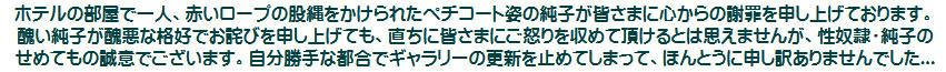 ブラジャーもキャミソールも、もちろんスカートもなし。赤いロープの股縄と2枚のペチコートだけ...でも、黒いペチコートをスカートに見立てて、謝罪の映像を撮影することができました。