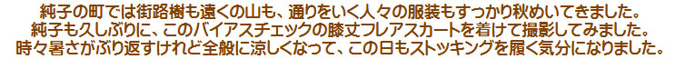純子はストッキングをストッキングを着ける日にはいつもガーターベルトで吊ることにしています。スカートの丈が短いと留め具が見えてしまいますが、このスカートは大丈夫!