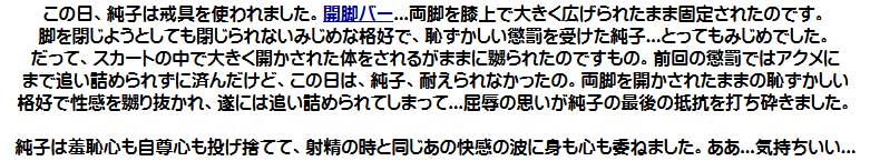 こんな短いスカートで!...みんなが見ている前でひざまずかされて公開懲罰にかけられる純子。乳首を責め具に噛まれる痛さ!...両脚を戒具で開かされたまま性感を嬲られる屈辱!...