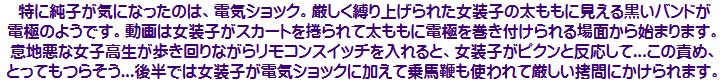この女装子の拷問で使われる電気ショック...太ももに付けられるバンド型の電極は純子が初めて見るタイプです。純子もスカートの奥にこの電極を付けられて苛められたい...