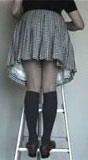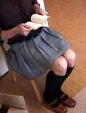 | ギンガムのプリーツミニスカート姿でプレゼンのリハーサル | ギンガムのプリーツミニスカート姿でドアの穴から外を覗く | |