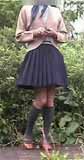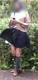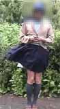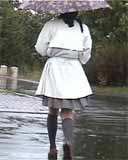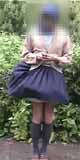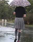 | へリンボンのプリーツミニスカートで雨の公園を歩く | レインコートを脱いでプリーツミニスカートを見られる |