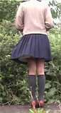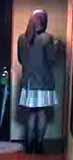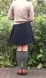 | 紺無地プリーツミニスカートでのお辞儀姿を後ろから見られる純子 | 紺無地プリーツミニスカート姿を風の中で回転させる純子 | |