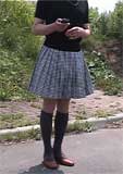 | 恥ずかしいくらい短いバイアスチェックのフレアーミニスカート...しかもそんなスカートで野外撮影! |