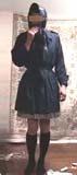 右の撮影の時は、紺のアンサンブルを合わせてみました。少し全体に長めですが、この格好で外出しました。