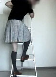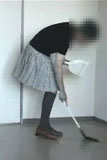 プリーツミニスカート姿の純子は倉庫のお掃除です。同じ倉庫で、先日は別のスカートでお掃除でした。