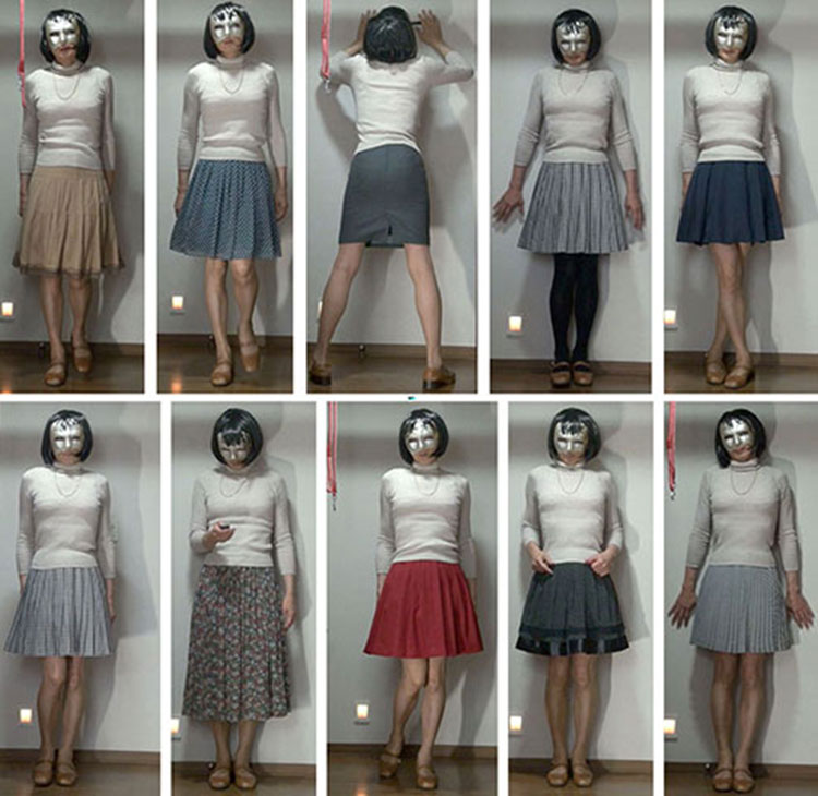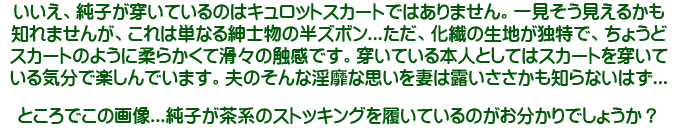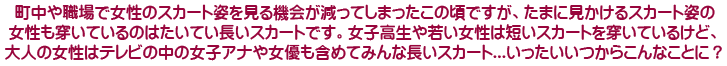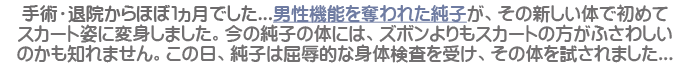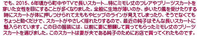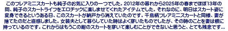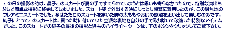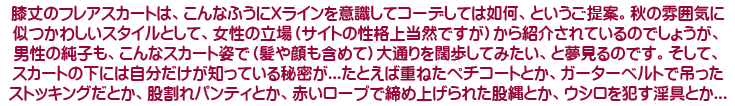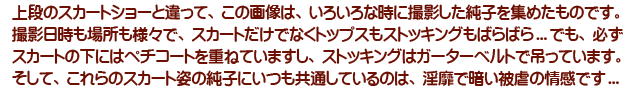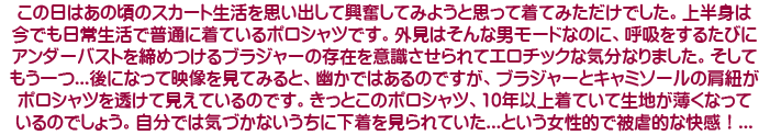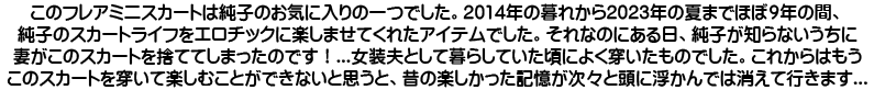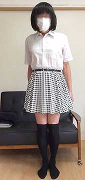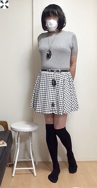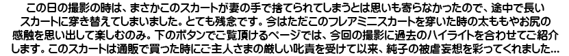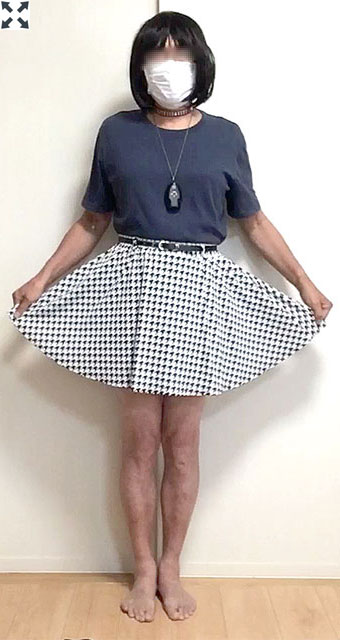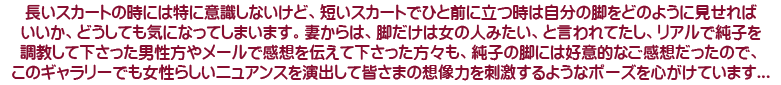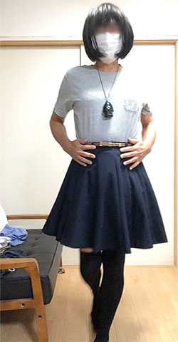![]() ![]() 妻の前での女装生活では、上半身はいつもと変わらず下半身だけスカートを穿きました。 (夫の女装によって妻も得るものがありました。)ポロシャツの下はランニングシャツだけです。 スカートの下は自由でした。妻がその中を検めるということはほとんどありませんでしたから... ![]() ![]() 9年前と同じポーズを取る純子です。同じスカート、同じポロシャツですが、下着が違います... ![]() [2023.08.20] ![]() ![]() ![]() 濃緑色のTシャツも黄色のポロシャツも、どちらも紳士ものです。スカートを穿いただけの純子。下着は婦人ものを着けていますが、それはズボン姿と同様に誰にも分からない... ![]() ![]() ![]() ウィッグを着けながら、いつもの純子に戻って行く自分の気持ちを意識しました。ああ...また...スカート姿のまま、衆人環視の中で強制射精させられる辱めを受けるのね... ![]() [2023.08.20] ![]() ![]() 短いスカートだと脚の露出が大きくなって恥ずかしいから、純子の場合、その恥ずかしさの思いが脚のポーズに表れてしまいます。 一般の女性はどうなのでしょうか?インターネットで女性のスカート姿の画像を検索してみました。商品やコーデの見本画像です。 ![]() [2023.05.10] |