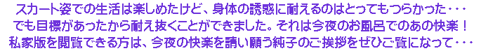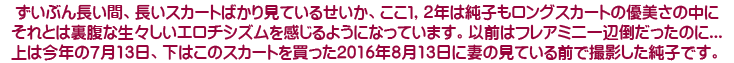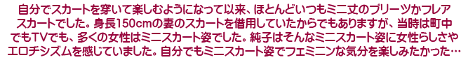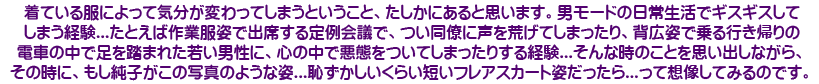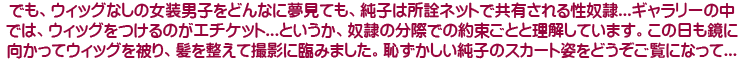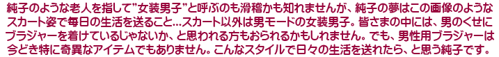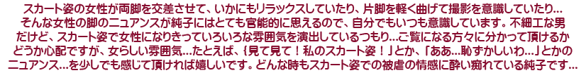 | 純子のスカート女装イメージを楽しめたと思う方はぜひご回答ください。 これからのギャラリーにみなさまのご意向を生かして行きたく存じます。 |