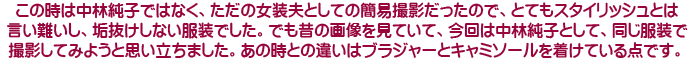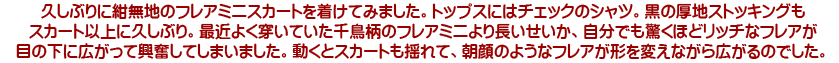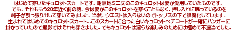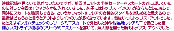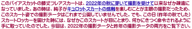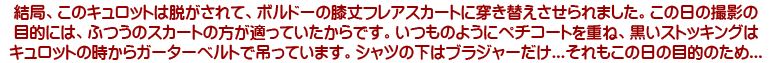 ![]() ![]() 2023年11月の純子です。ほぼ1年ぶりにこのスカートを穿きました。 ![]() ![]() スカートだけでなく、ペチコートを3枚重ね、ストッキングをガーターベルトで吊っているのも共通です。 トップスは違いますが、その下のブラジャーとキャミソールも共通です。外見からでは判りませんが・・・ ![]() ![]() あの頃トップス・アウトのスタイルを純子が好んだ理由は、今となっては判然としません。トップスがニットの長袖タートルや 半袖サマーセーターにほぼ限られたので、トップス・インにしなくてもウエストのくびれや曲線をそれなりに演出できたせいかも 知れません。今も昔も純子の理想の女装スタイルはフィット&フレア。上半身の拘束感と下半身の解放感の対比が大好きです。 [2024.07.20] |