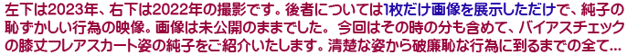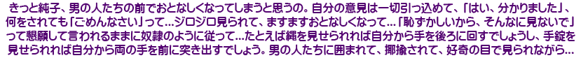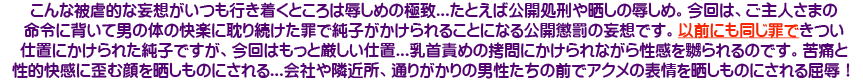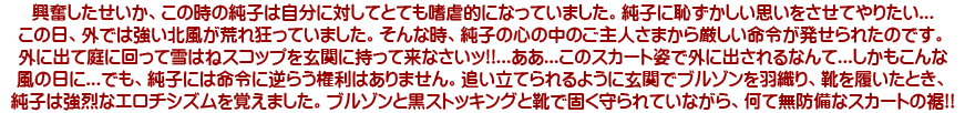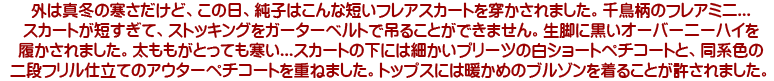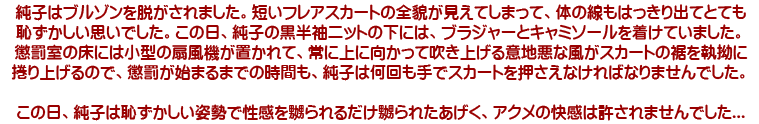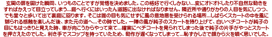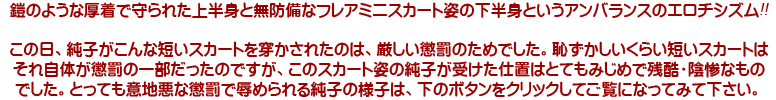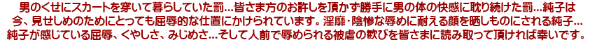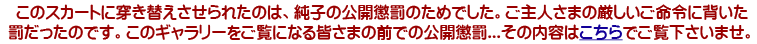 ![]() ![]() ブラウスの下はいつもとちがってブラジャーだけ...その理由はこちらをご覧になって... ![]() ![]() こんな恥ずかしいスカート姿で同性の方々の前に出るときの緊張と期待を想像すると、体が熱くなります... ![]() [2023.04.02] ![]() ![]() 黒タイツに見えるかもしれませんが、厚手ストッキングをガーターベルトで吊っています。 ![]() ![]() これから外へ出て庭へスコップを取りに行く純子です。カメラはオンのまま玄関を出ました... ![]() [2023.02.27] ![]() ![]() 先日の疑似キュロットではなく、プリーツが入っている真正のキュロットミニスカートです。 [2023.01.03] ![]() ![]() キュロットとフレアスカートとで体感的な穿き心地の違いはありません。ただ、心理的にスカートの方が無防備です... [2023.01.03] ![]() ![]() この日、ストッキングは履かずに生脚+オーバーニーハイというスタイルで撮影を受けました。足元に置かれた小さな扇風機が意地悪な冷たい風をスカートの中に送り込んでくるのです... ![]() ![]() ブルゾンを脱ぐとスカートを押さえる上着がなくなって、意地悪な風で広がり放題...でも、このスカートには黒色の裏地が付いていて、恥ずかしい体が見えることはありません。 ![]() [2023.01.24] ![]() ![]() 社内公開仕置のあまりの恥辱に顔を伏せたいのに竹笞で無理やり持ち上げられて... ![]() [2023.01.25] |