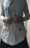 最近好んでいるのは、サロンエプロンというのか、短めの丈で、裾にフリルがあり左右非対称のポイントもあって、メイド風の印象です。