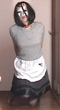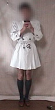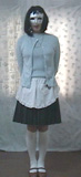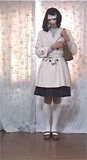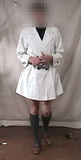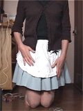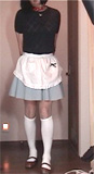 左の写真はかなり昔の撮影ですが、胸当てつきエプロンです。黒ストッキングでハイソックスも履かず、靴は赤いハイヒールでした。
