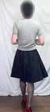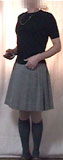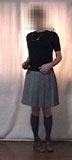 黒に見えますが、濃いグレー(チャコールグレー)のプリーツミニスカートです。膝上数センチ程度なので、膝丈と言ってもいいでしょう。