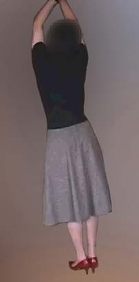 両手を手錠で拘束され、天井に吊り上げられているっていうイメージ。 きっとスカートの上から鞭でお尻をぶたれるわ... いいえ、スカートは無残に捲り上げられて、衆人環視の中で辱しめられるんだわ。 厳しいお仕置き、折檻、そして辱め... 私の妄想です。スカートを着けると、いつもそんな妄想が沸いて来ます。