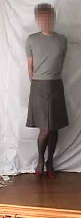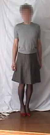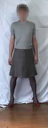 ウールツイードテーストの膝丈セミフレアーカート。ジャスコイオンだったかしら? 妻の好みです。私も嫌いではないけど。 裏地はしっかりタイトです。風で捲くれあがることなど絶対にありえないスカート! 私にはもの足りません。女性にはいいだろうなって思いますけど。 裏地がタイトめで、表地がフレアーだと、からだの線がスカートに出ることもありません。 そういう点では、男性向きと言えなくもないけど...
