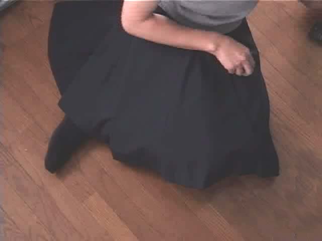フロアに横座りになってときの撮影。カメラは上にあります。 別シリーズの写真では、離れたところにあるものを取ろうとして、 横座りから姿勢を崩し、スカートの裾も乱れてしまいました。 このシリーズでは、両脚を伸ばして膝を揃えるという動作をします。 芝生や海岸でも同じ動作をすることもあるでしょう。 両脚は前に出すので、いちおうスカートの裾の乱れはいつも見えることになりますが...