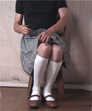 椅子に座ると、立っている時以上に、スカートから伸びる脚が目立ちます。白いハイソックス...脚以上に目立っています...