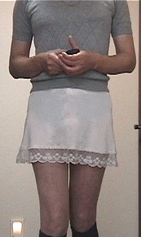 スカートを着ける前にスリップ姿の純子を撮影してみました。恥ずかしい...この時はいつものペチコートは重ねませんでした。 スカートが短すぎて、ペチコートもあまり役に立ちそうになかったから...フレアーミニスカートにスリップ1枚...すごく心細いわ... スカートの下にこんな短い下着でも重ねていると、万が一スカートを脱がされても恥ずかしい秘密を守れる、っていう安心感があるのかしら?