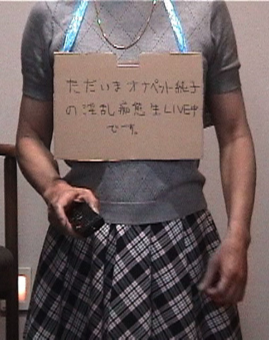 2回のスカートライブで純子は、恥ずかしい言葉を書いた札をぶら下げるよう命令されました。恥ずかしい晒しものね... ごくふつうのスカート姿...清楚なイメージを大切にした、ごくふつうのスカート姿でこんな札をぶら下げるのって、辱めね... 純子がいかにもいやらしい人みたい...清楚なスカート姿のくせに淫乱なからだと心をスカートの下に隠した被虐変態の女装男...